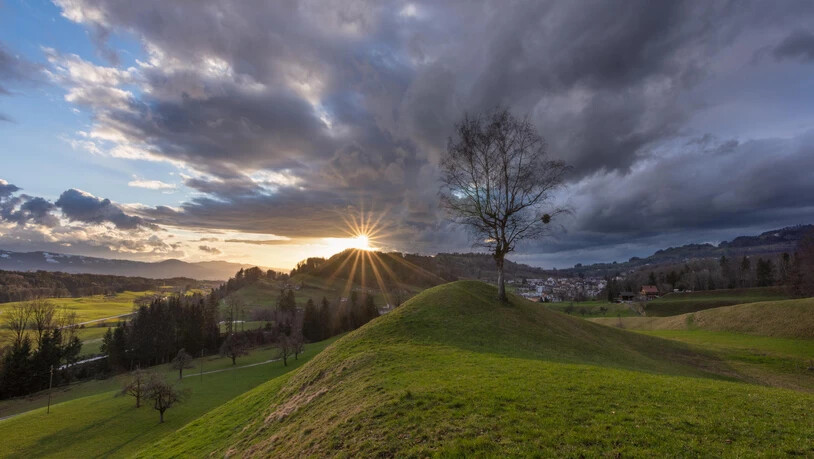 Schon seit einigen Tagen war der Frühling da und die ersten Blumen spriessen aus dem Boden. Eigentlich hatte ich eine andere Bildidee im Kopf, als auf dem Bild zu sehen ist. Ich wollte ursprünglich die ersten Blumen des Frühlings fotografieren. Als ich welche fand, wurde mir bewusst, dass das Fotografieren der Blumen nicht möglich war, da es zu fest stürmte. Zum Glück fand ich diesen wunderbaren Baum und konnte doch noch den Sonnenuntergang mit einem schönen Vordergrund auf Kamera festhalten. Beim Warten wechselte das Wetter immer zwischen Regen und Sonnenschein. Kurz bevor die Sonne von meinem Standpunkt aus nicht mehr zu sehen war, strahlte die Sonne noch einmal mit voller Kraft. Mit dem stürmischen und schnellbewegenden Wolken ergab dies eine wunderbare Stimmung. Das Bild habe ich in Goldingen, in der Nähe von Laupen und Lütschbach aufgenommen. Nachdem ich von drei Rehen überrascht wurde, ging ich nach Hause ins Warme.