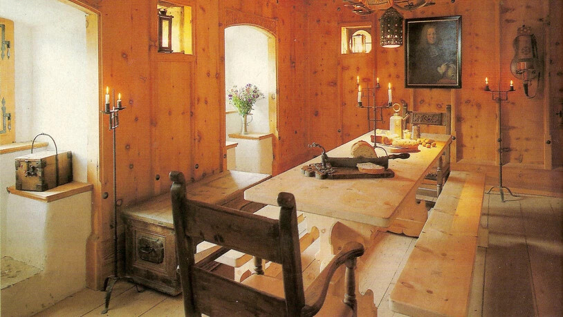 Wir sitzen hier also auf einer Burg. Fährt man auf der A13 Richtung San Bernardino aus den Tunneln der Viamala, liegt sie links oben. Burgen am Hinterrhein sind nun wirklich nichts Ungewöhnliches. Diese hier aber schon. Die beiden Fensterlein in diesem Raum, aus denen hat ziemlich sicher auch schon im Mittelalter jemand geschaut. Aber die Decke, von welcher der mächtige Leuchter hängt, die ist noch keine 50 Jahre hier. Auch die anderen Stuben und Kammern mit ihren Wandtäfern, Kassettendecken, Malereien und Schnitzereien wurden nicht von den Herren von Reischen in Auftrag gegeben.