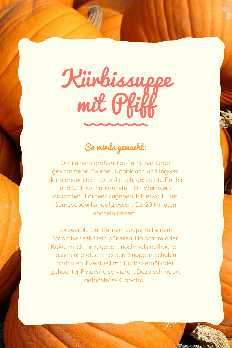 Wir wählen einen essbaren Kürbis. So verschwenden wir nichts, und können uns mit dem ausgeweideten Fruchtfleisch später ein delikates Süppchen kochen (Rezept unten). Geeignete Sorten sind etwa Hokkaido-, Butternuss-, oder Muskatkürbisse. Je frischer der Kürbis beim Kauf, desto länger wird er sich halten. Reife Kürbisse lassen sich übrigens mit der Klopfprobe erkennen: Wenn der Kürbis dumpf und hohl klingt, schmeckt er am besten.
