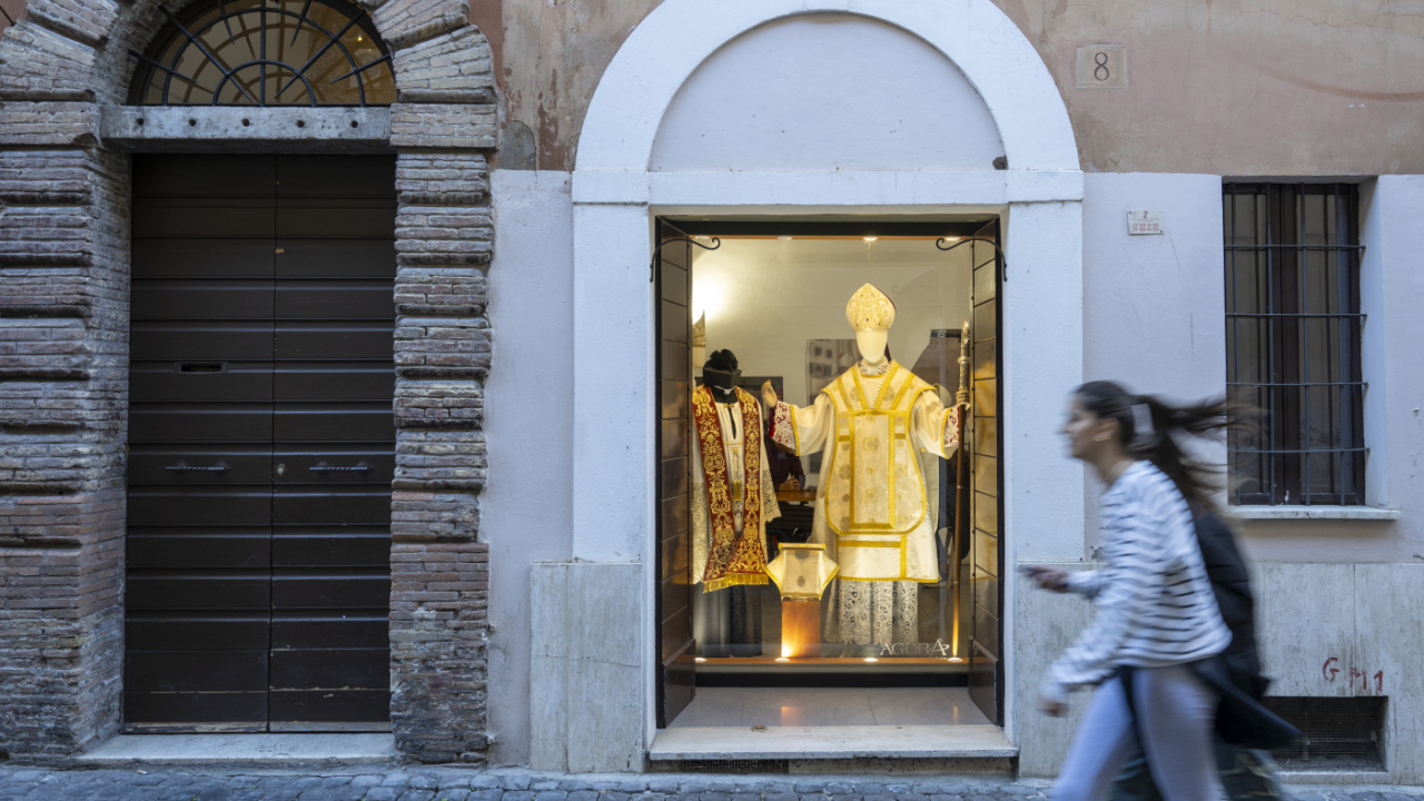 Eine Stola in Weinrot, über und über bestickt mit goldenen Ornamenten, daneben ein von Perlen und dunklen Steinen besetzter Bischofshut mit schwungvollen, silbernen Ranken: Wer am Schaufenster des wenige Schritte vom Vatikan entfernten «Agorà Atelier» vorbei spaziert, sieht vor allem ein Glitzern und Glänzen.