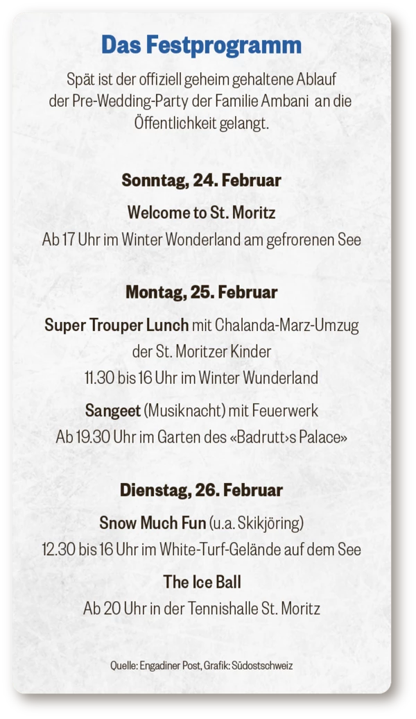 Fünf Wochen lang war daran gebaut worden, und die Ideen der Hochzeitsplaner für die superreiche indische Familie hatte den Engadinern sogar ein Riesenrad beschert. Grössere Fahrgeschäfte finden den Weg nämlich sonst nie ins Hochtal. Die riesige Halle mit dem «Winter Wonderland» und dem umgebenden Jahrmarkt erlebte Sonntagnacht ihre bunt glitzernde Feuertaufe beim Auftakt der dreitägigen Junggesellenparty, welche der Milliardär Mukesh Ambani derzeit in St. Moritz für seinen ältesten Sohn und dessen Braut ausrichtet. Es war offenbar ein eher familiäres Fest im Stil eines Kindergeburtstages.