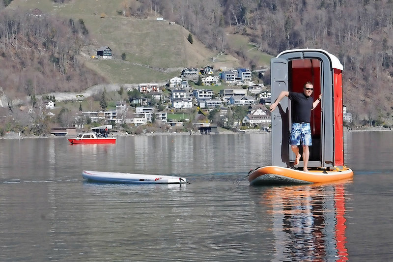 «Unser Sport ist eigentlich umweltfreundlich, weil die Stand-up-Paddler ohne Motor auskommen», sagt Michi Seliner – beim Stand-up-Paddeln steht man auf einer Art Surfbrett und beschleunigt mit einem Paddel. Trotzdem teilt er mit vielen anderen Freizeitsportlern das Anliegen, etwas für die Umwelt zu tun. So entstand die Idee, während der Hauptsaison im Sommer WC-Häuschen auf den Seen zu platzieren. In Fritz Vogel und Raphael Ziegler von der Firma VZ-Kanalreinigung in Wangen fand er Partner, die ähnlich denken und bereit waren, ihren Beitrag zu leisten.