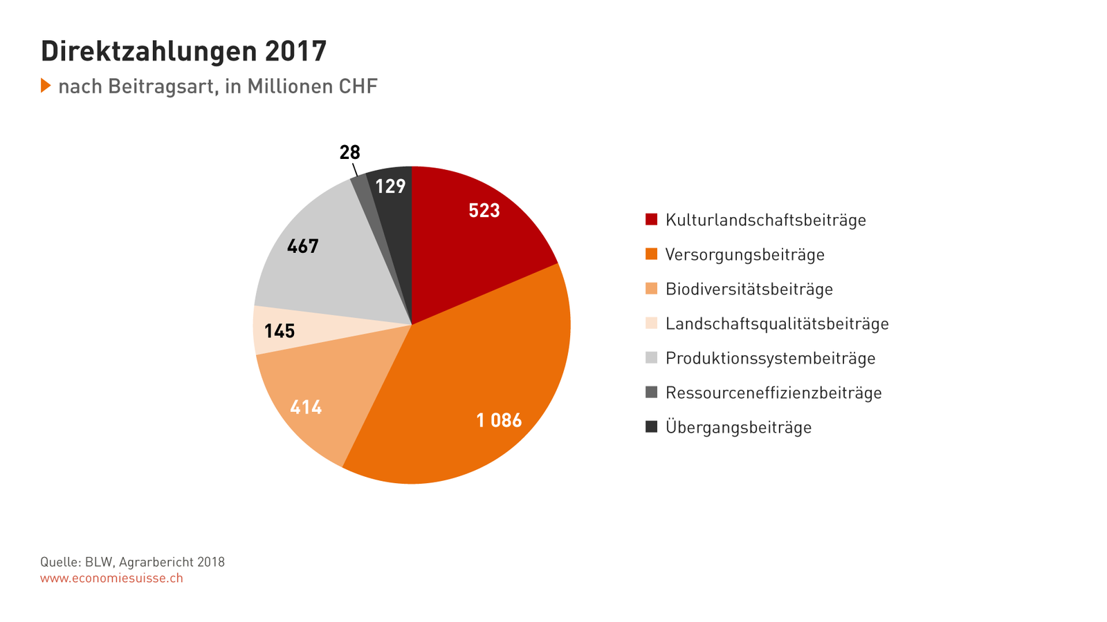 In der Schweizer Landwirtschaft gibt es drei Kategorien von Subventionen: die Direktzahlung, die Produktions- und Absatzförderung und die Förderung der Strukturverbesserung und soziale Massnahmen. Bei der aktuellen Debatte handelt es sich um die Direktzahlungen. Diese machen den mit Abstand grössten Anteil des jährlichen Agrarbudgets aus. 2017 waren es gemäss Economiesuisse 75 Prozent des gesamten Budgets.
