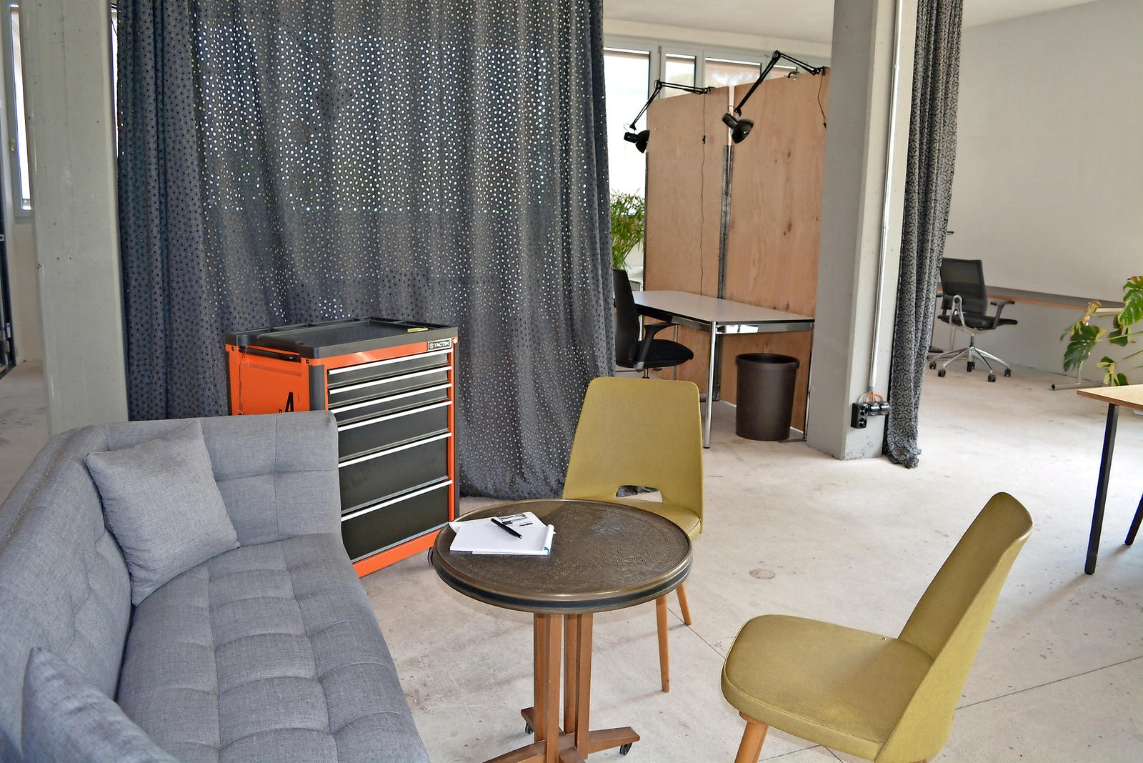 Die relativ hohe Auslastung nach noch nicht einmal einem ganzen Jahr und ohne Werbung erstaunt nicht: Der helle, grosse Raum mit den hohen Decken und Sichtbeton ist stilvoll eingerichtet. Es gibt einzelne Arbeitsplätze, die teils mit Wänden und massiven Stellwänden, teils mit Vorhängen voneinander getrennt sind. Aber auch lange Tische und das bereits erwähnte Sofa stehen hier und laden zum Diskutieren ein.