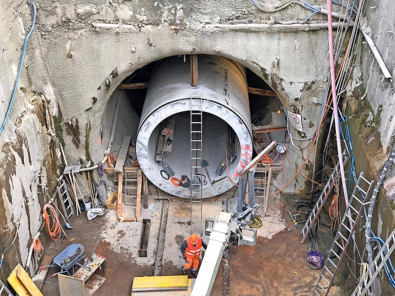 Bevor das geschieht, werden Löcher in die Elemente gebohrt, die sich im Stollen befinden, und Beton in den Hohlraum eingespritzt, der zwischen dem Rohr und dem im Tagbau erstellten Stollen liegt. Anschliessend wird der fertige Stollen eingehend kontrolliert, bevor die letzten zwei Elemente verlegt werden. Dann ist die Druckleitung als zentrales Element des Projekts durchgehend verbunden.