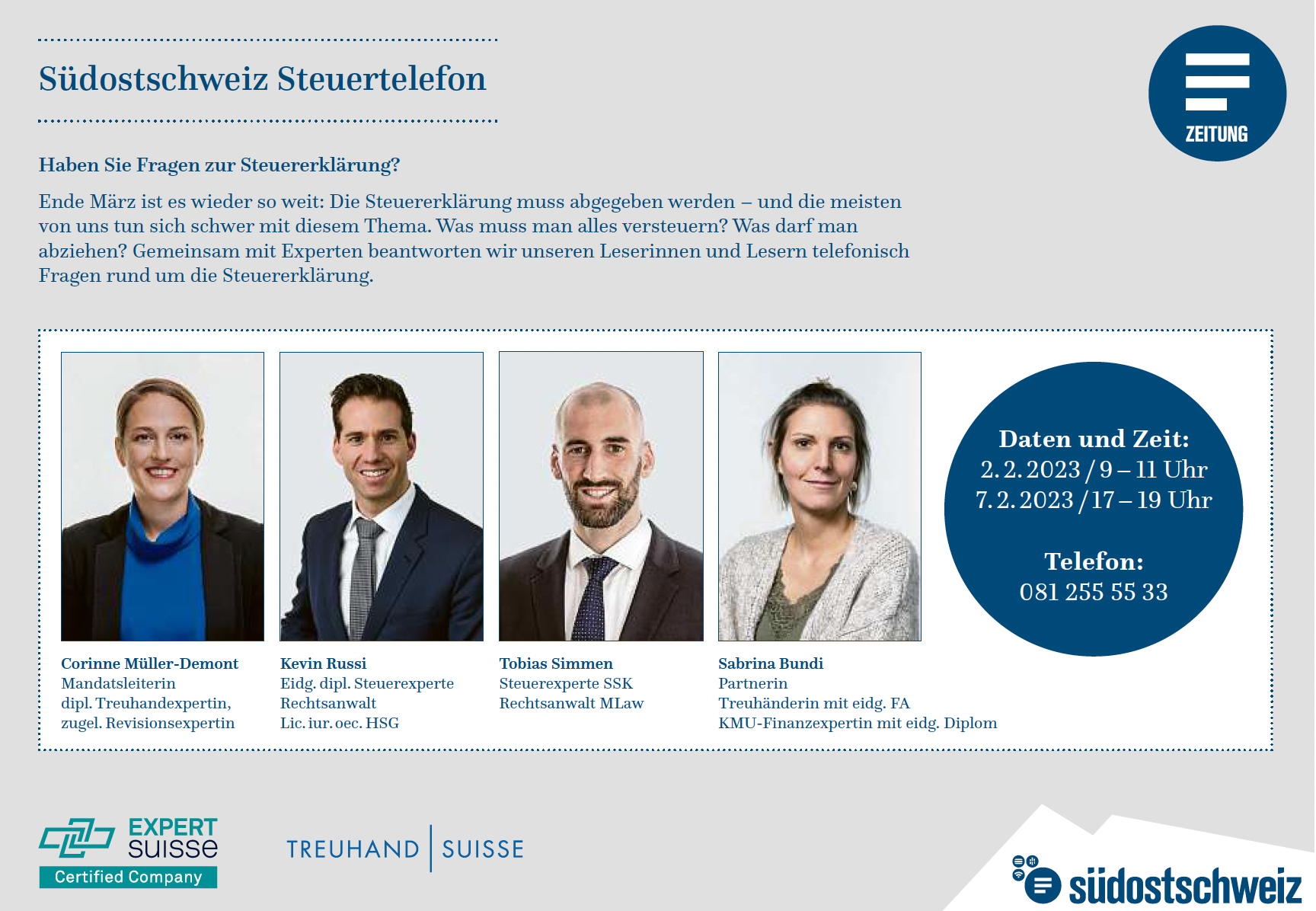 Das Angebot ist kostenlos. Die häufigsten Fragen werden nach dem Steuertelefon aufbereitet und in der «Südostschweiz» sowie auf «suedostschweiz.ch» veröffentlicht. (red)